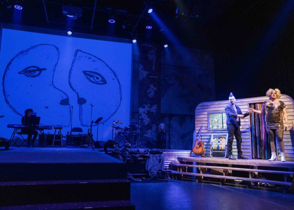 A stage set for "Hedwig and the Angry Inch" musical. On the left, a large blue screen displays a sketch of a face with prominent eyes. Musical instruments are set up in front of it. To the right, two actors stand on a small stage made to look like a trailer or mobile home. One actor, likely portraying Hedwig, wears a blonde wig and sparkly dress. The other has a punk-style mohawk. Props include a guitar and a lawn chair. The backdrop shows exposed brick walls, and theatrical lighting bathes the scene in blue.